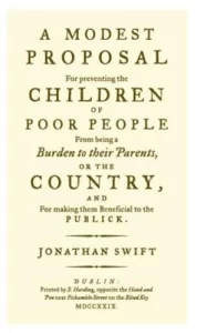 ‘A Modest Proposal For Preventing the Children of Poor People From Being a Burden to Their Parents or Country, and For Making them Beneficial to the Publick,” commonly referred to in English Lit as “A Modest Proposal,” is a Juvenalian satirical essay written and published anonymously by Jonathan Swift in 1729.