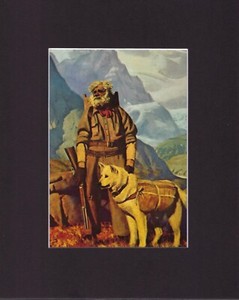 In addition to landscapes of Alaska’s glaciers, majestic mountains and iced-over coastal ranges, Fred painted on hardboard the animals and rugged people of a bygone era: polar bears, grizzlies, sourdough prospectors, Eskimos and native peoples, sled dogs, and whale harpooners.