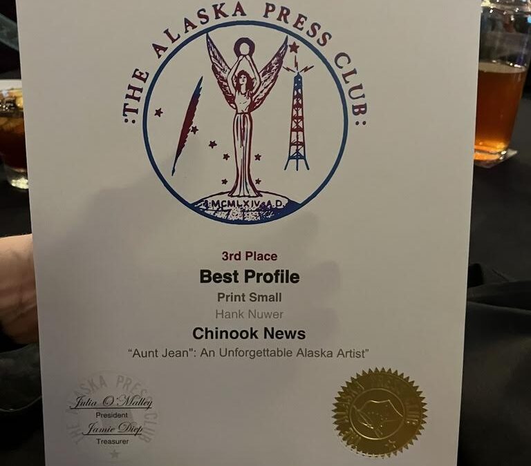 Pleased to receive 3rd place for Best Profile, small circulation papers. The certificate names wrong winng paper. It should be Cordova Times. Thanks for the recognition, APC!!!